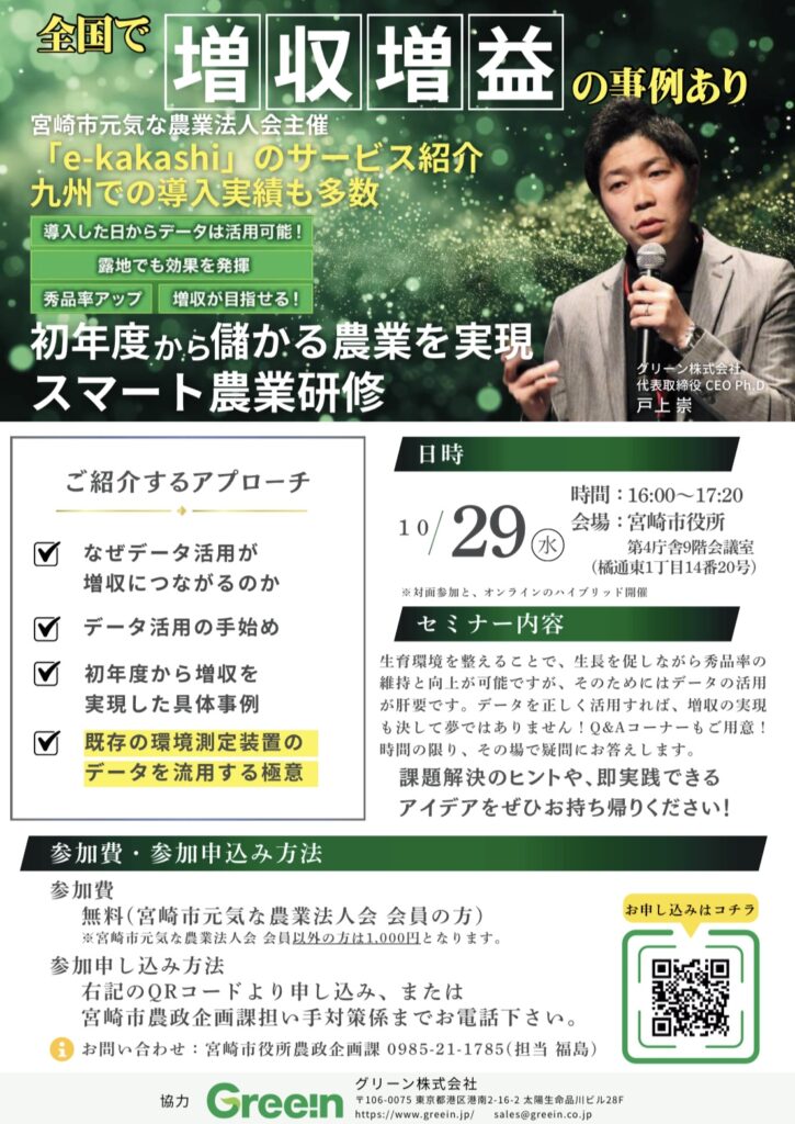 宮崎市元気な農業法人会主催の研修として、下記の内容でスマート農業の研修会を開催をします。研修内容について興味がある方はぜひご参加ください。